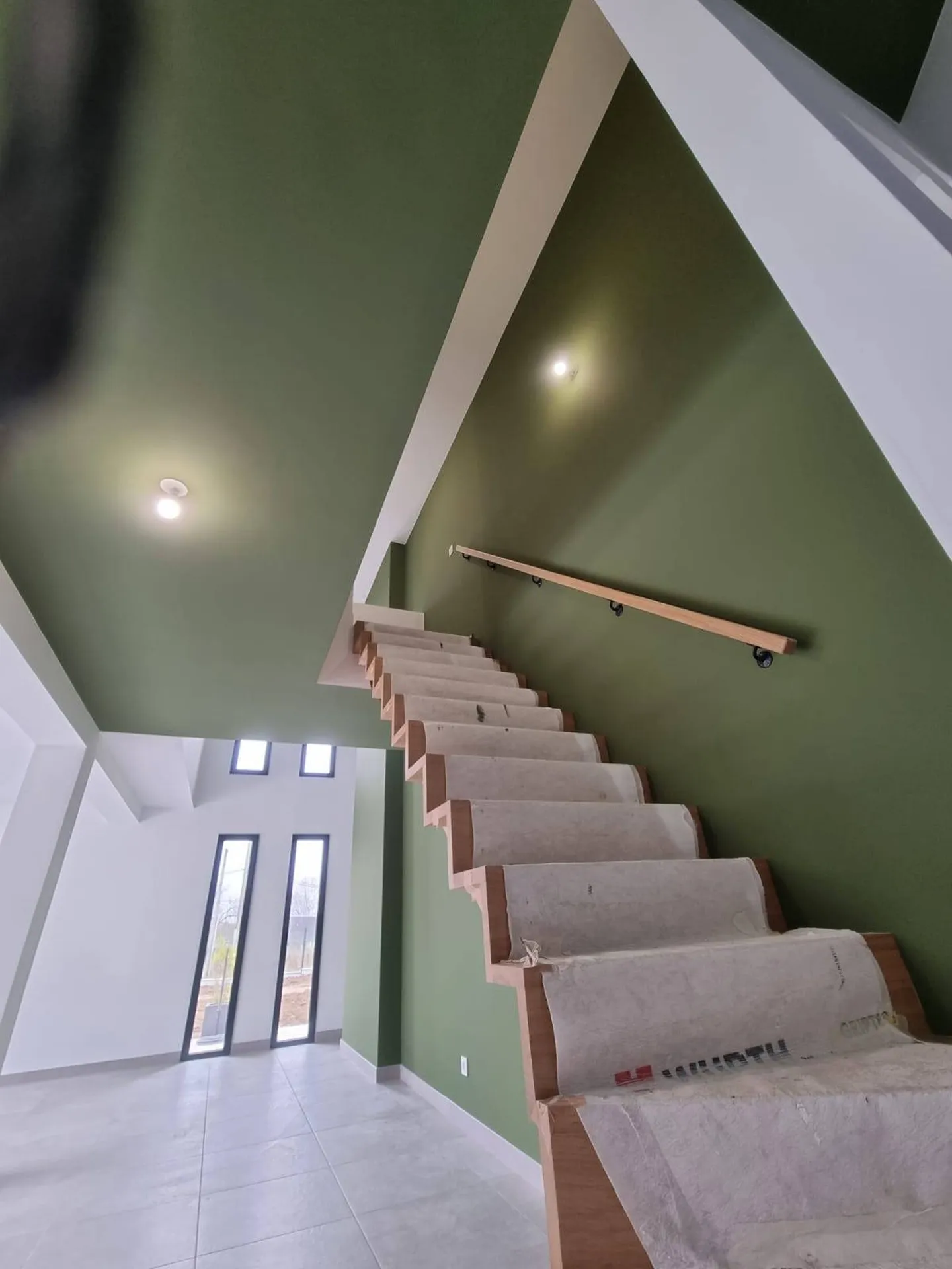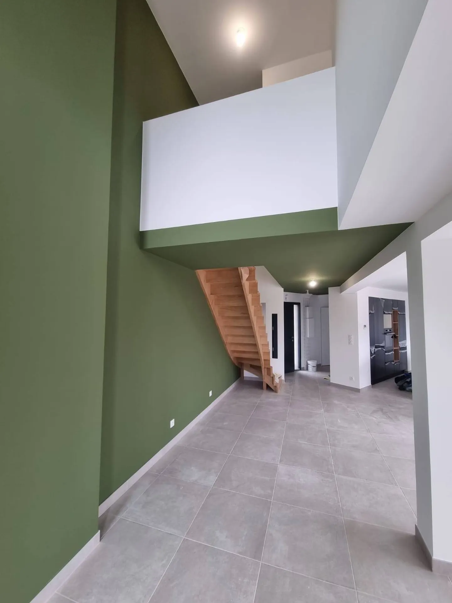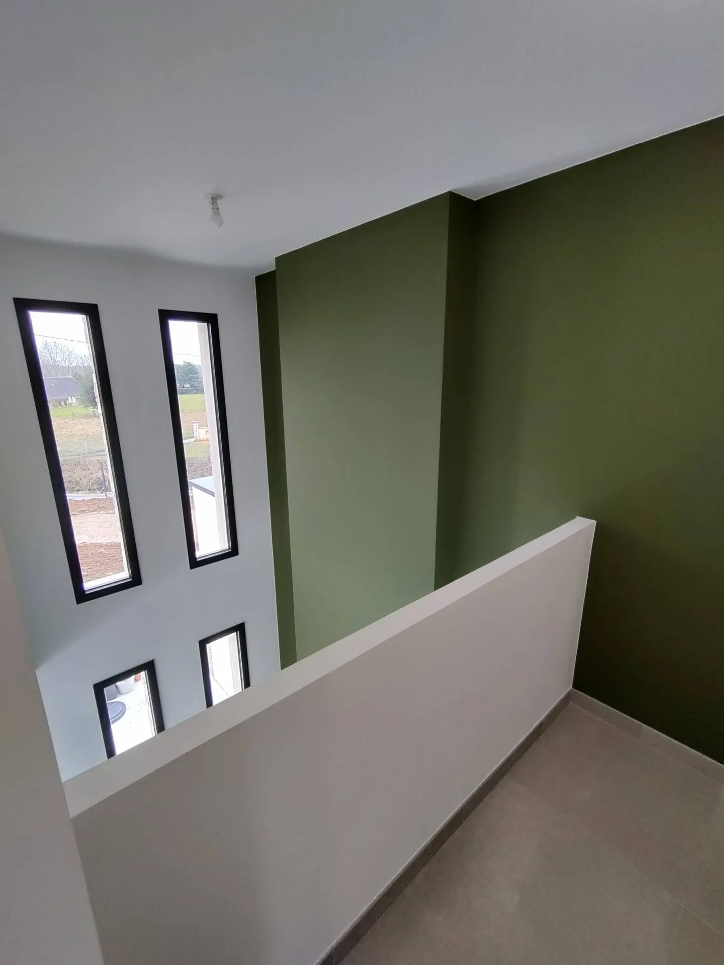 Nous avons combiné à la projection AIRLESS, l’association de couleurs, appliquées cette fois de manière traditionnelle ; sur ce chantier, situé à proximité de Brionne près de Bernay, nous avons effectué toute la protection, la préparation des supports et la mise en peinture blanche mate au pistolet haute pression, et avons sublimé l’espace entrée/cage d’escaliers par une couleur choisie dans le nuancier ARGILE PEINTURE – couleur de Terre.