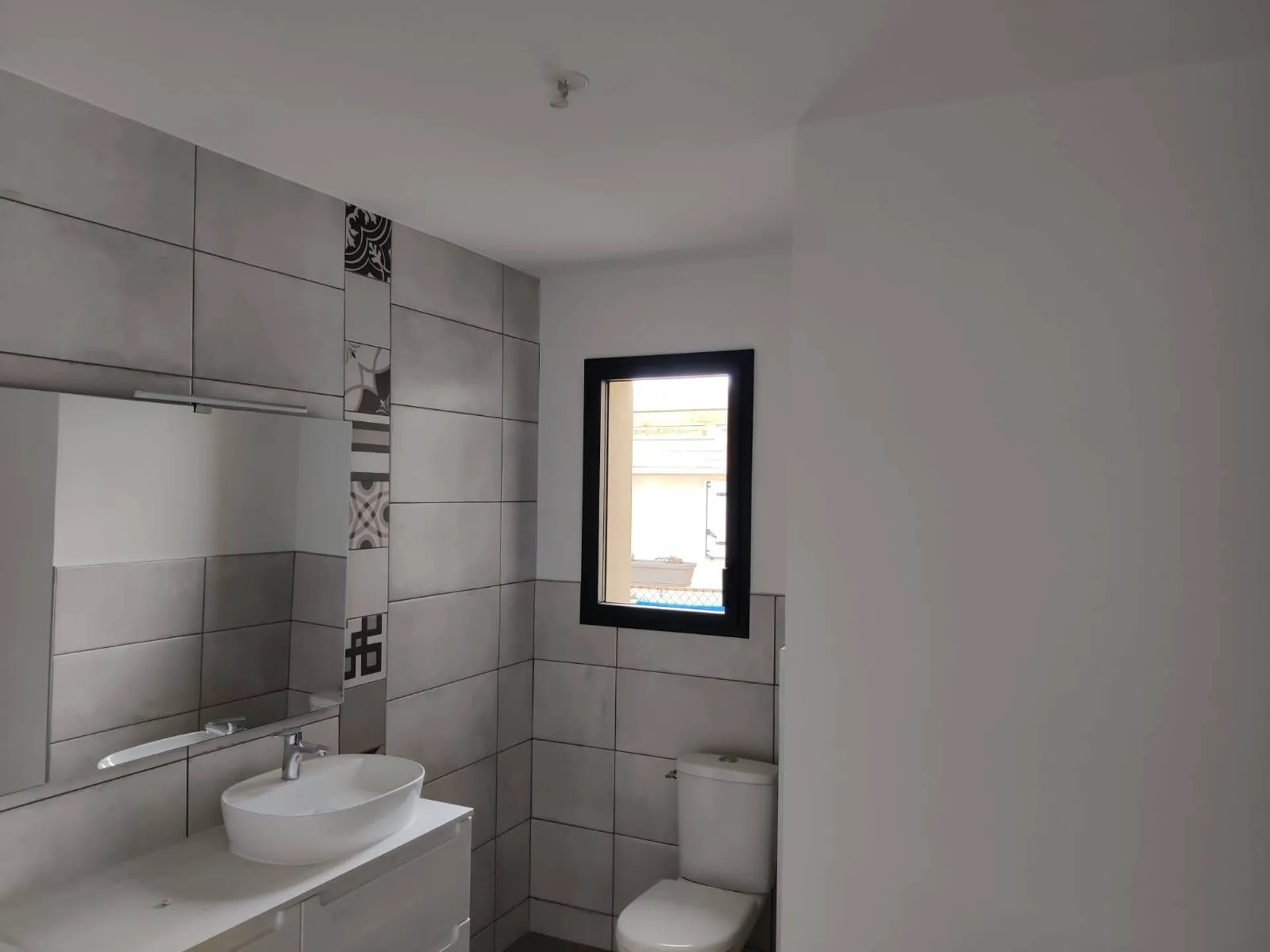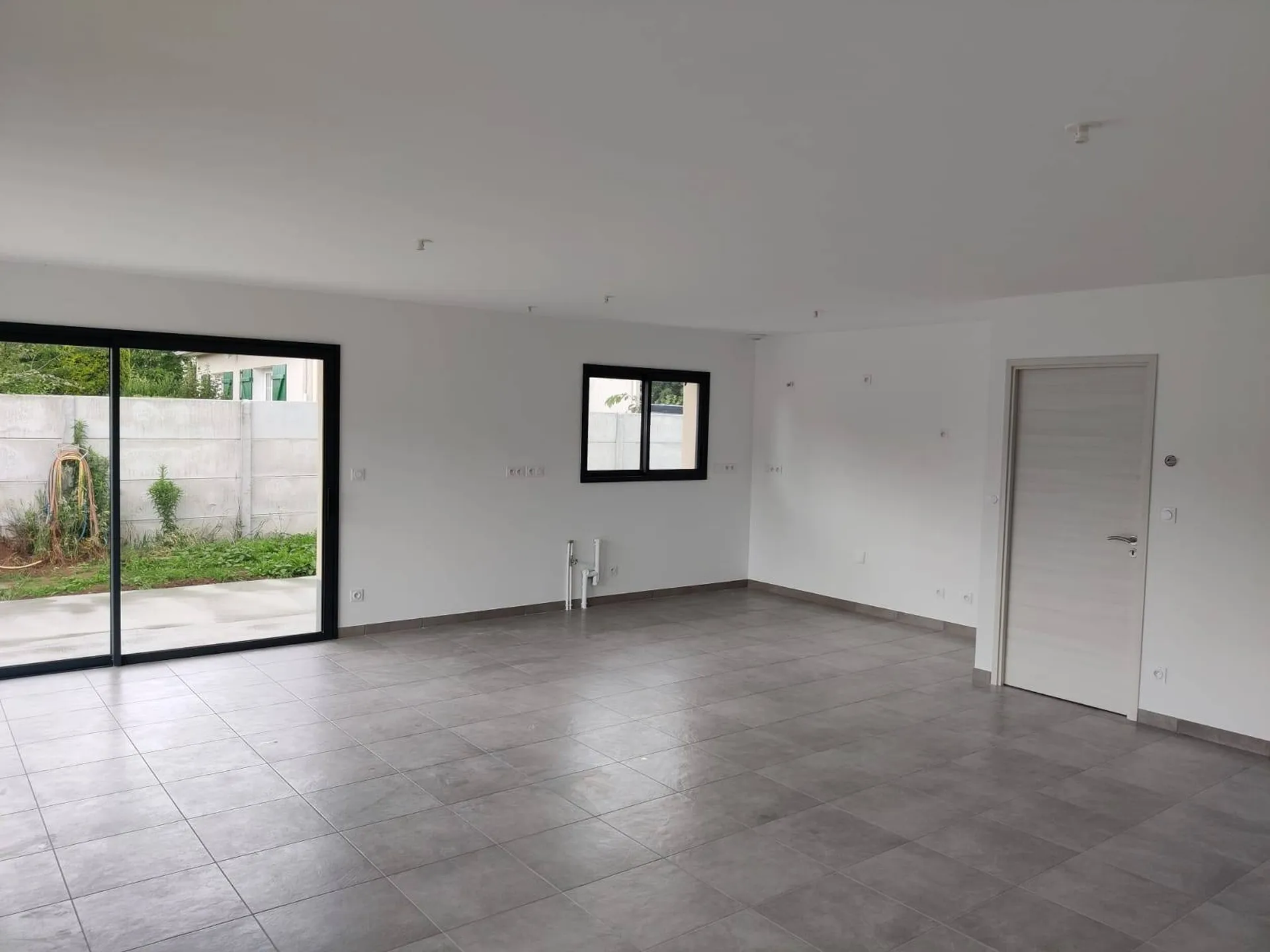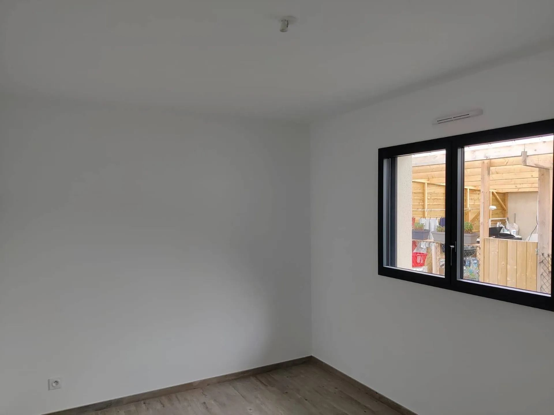 Cette maison a été réalisée par projection AIRLESS en finition blanche mate avec au préalable un enduit lissé, deux ponçages sur l'ensemble des supports et une révision au phare halogène après la couche d'impression.