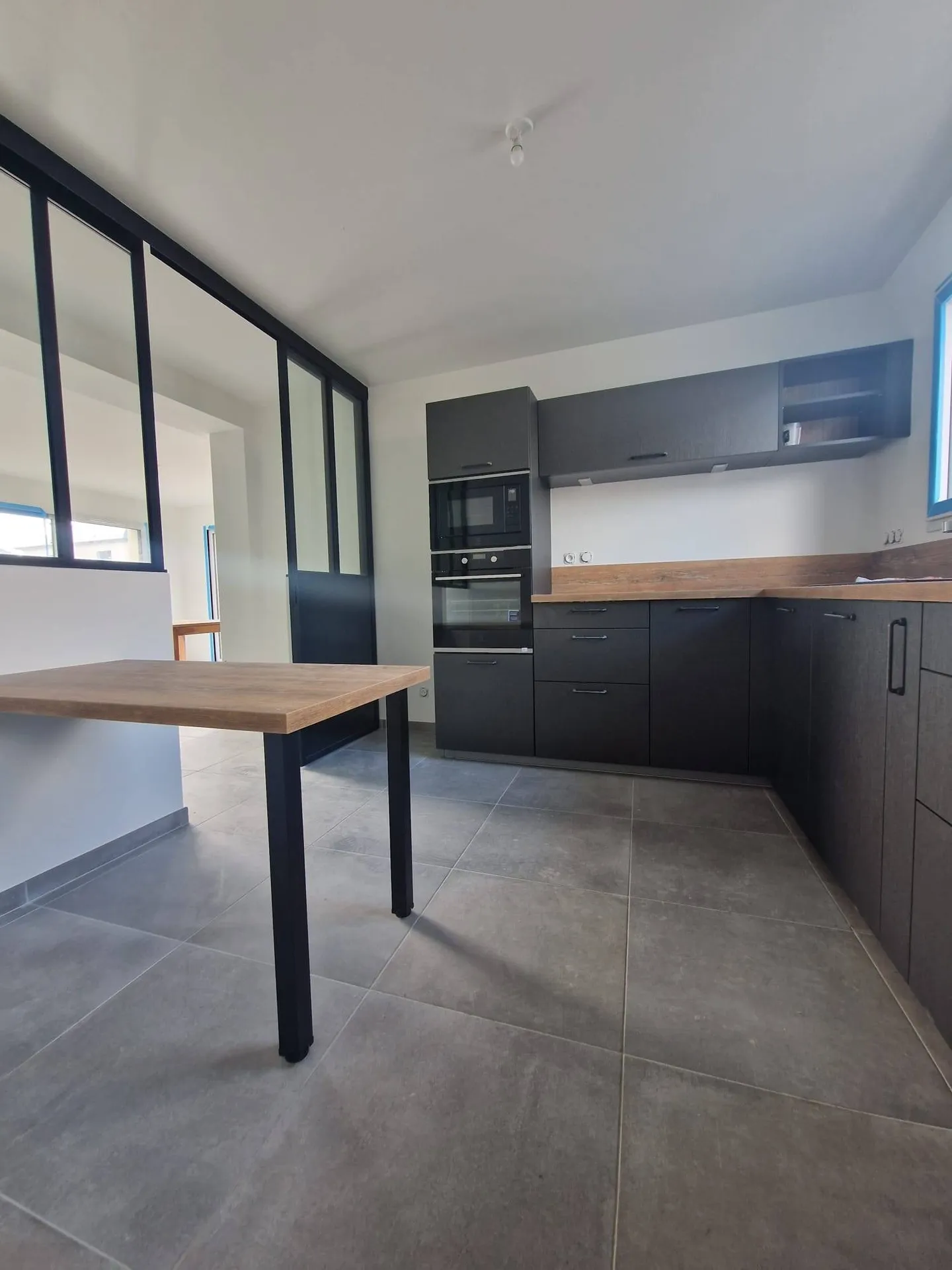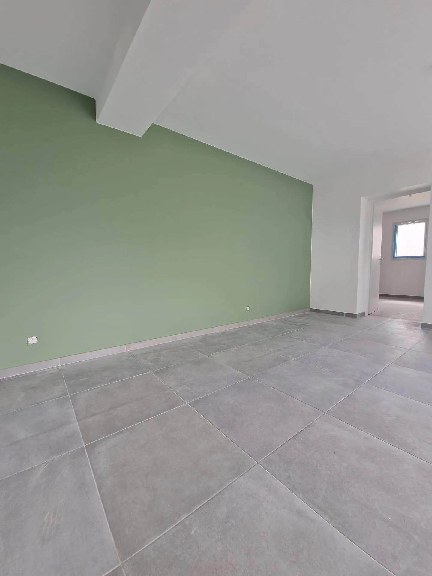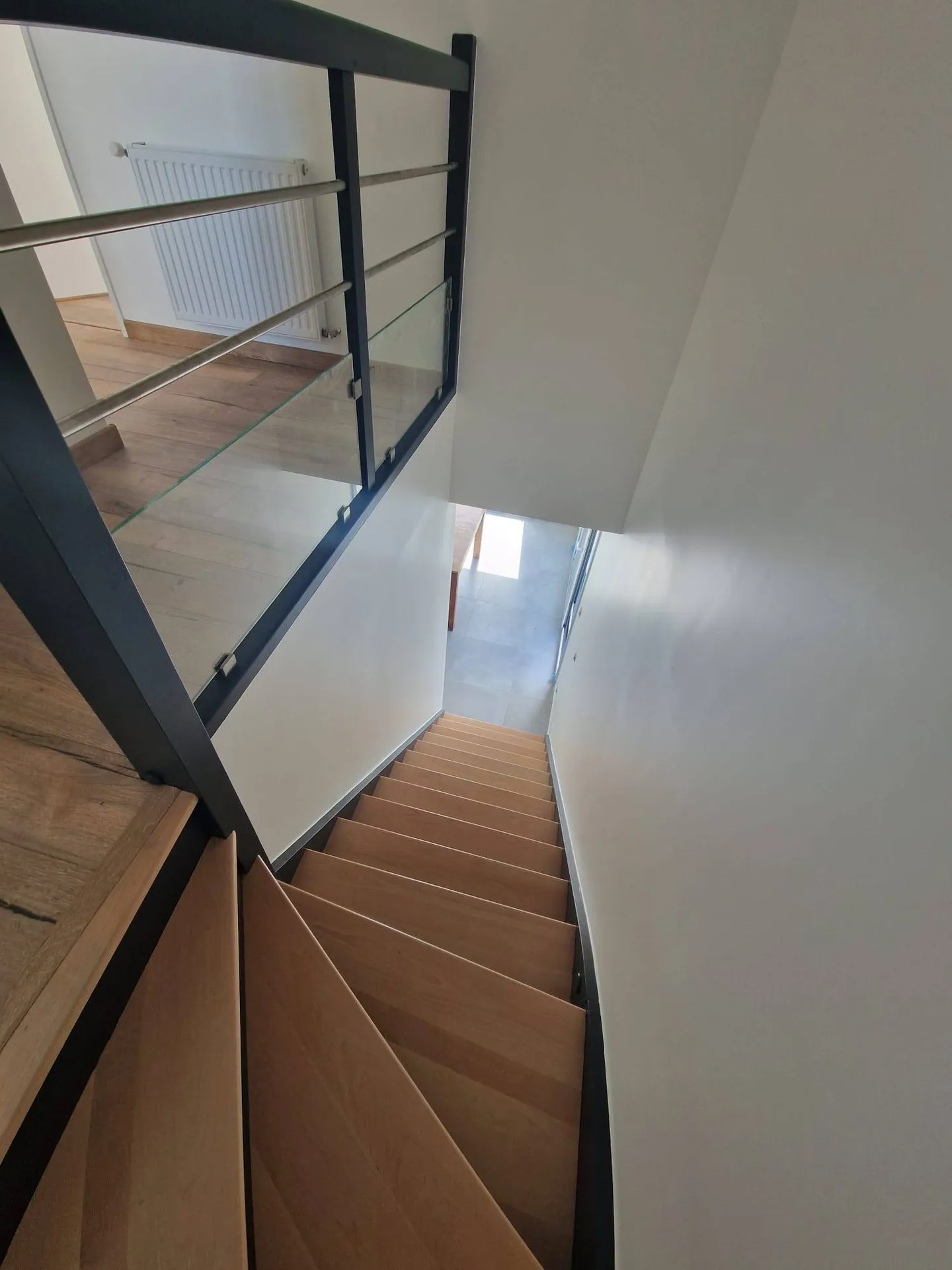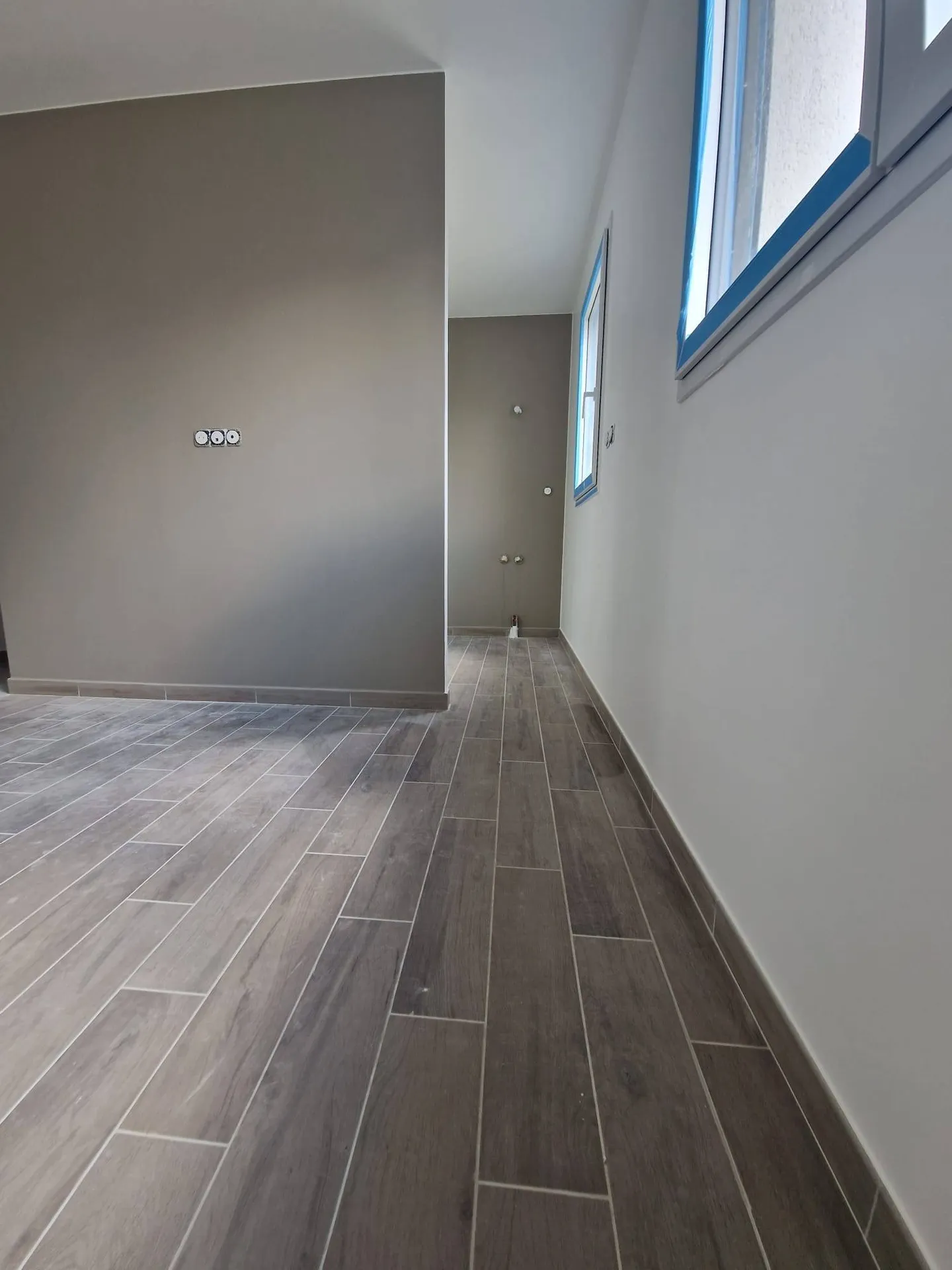 Voici la réalisation d'une maison neuve pour laquelle nous avons effectué toute la préparation des supports avec notamment un enduit lissé et deux ponçages avant la projection d'une peinture de finition blanche veloutée.