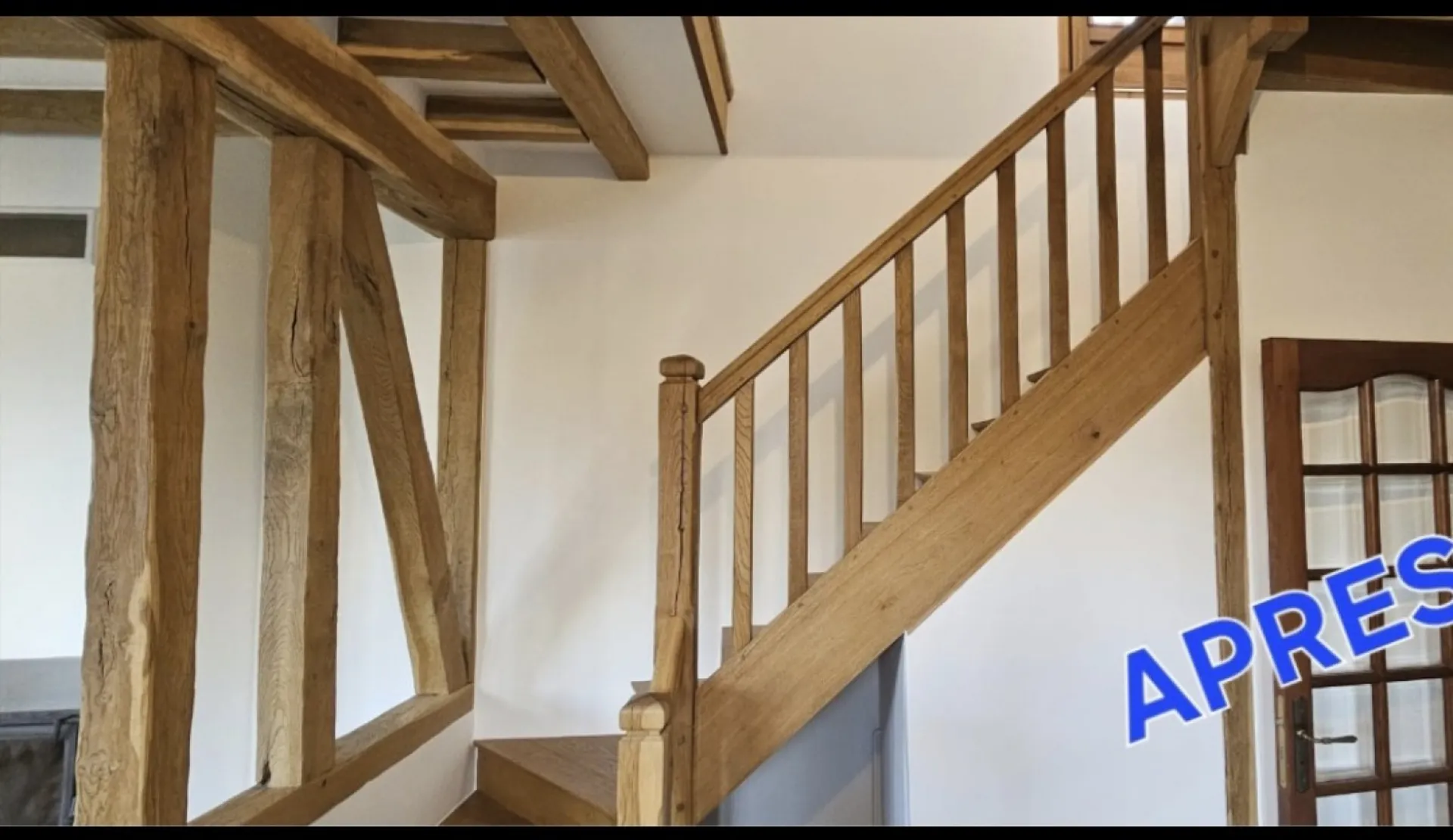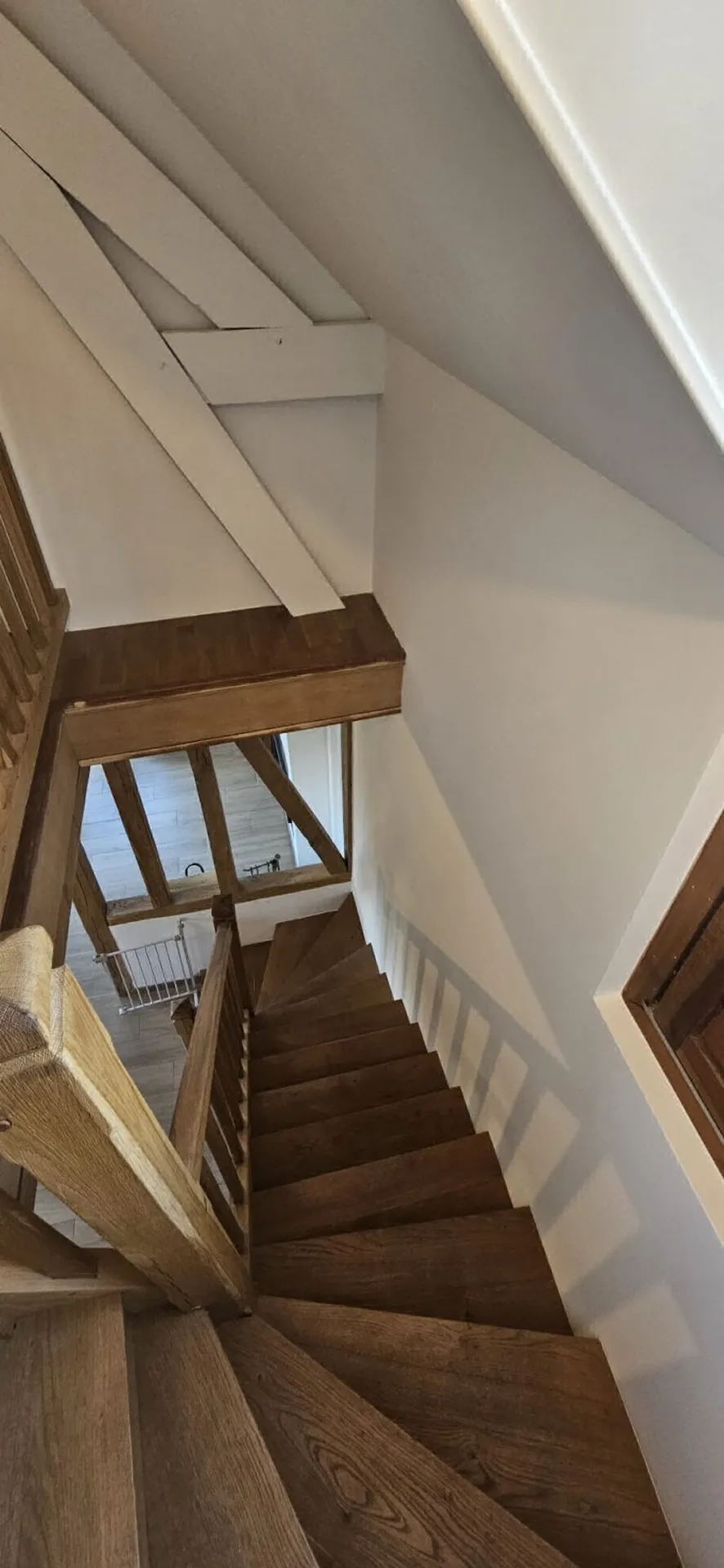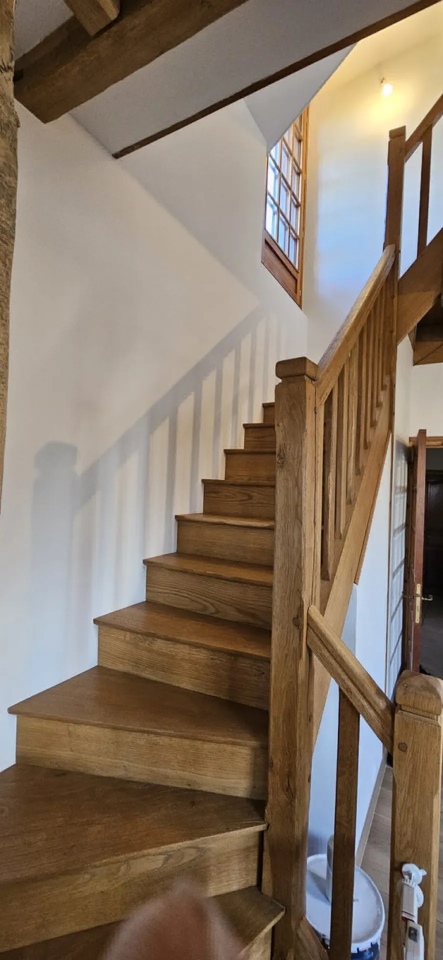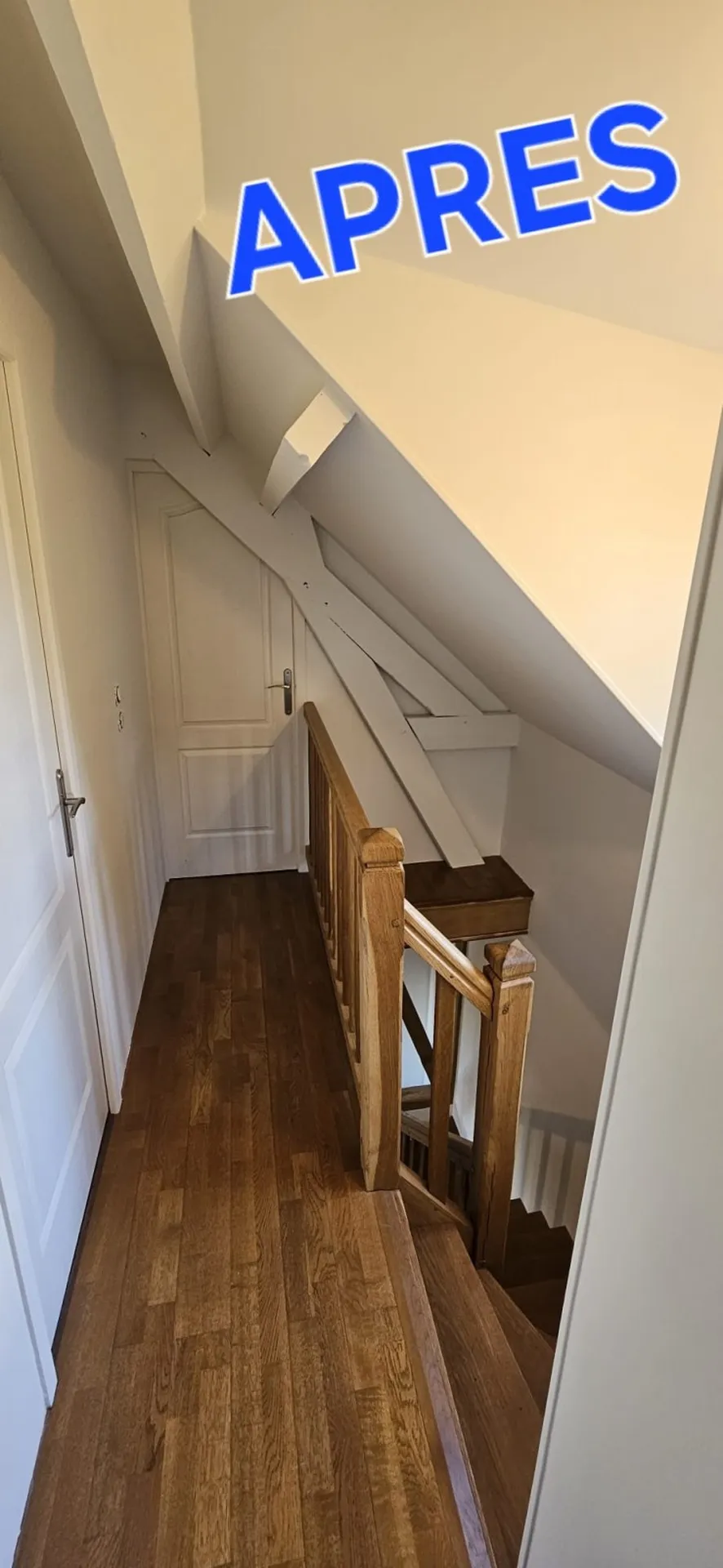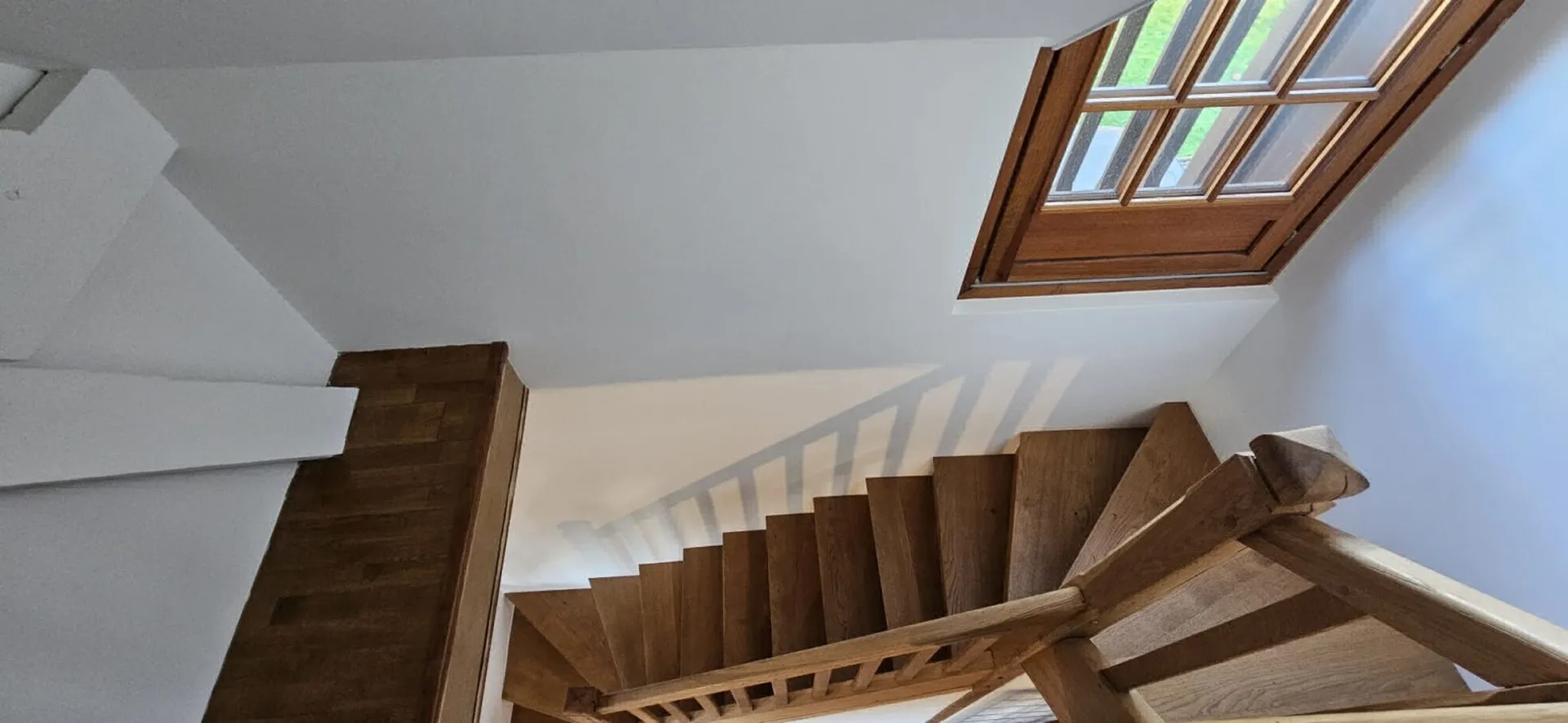 Une impression blanche a été appliquée après un minutieux ponçage, suivie d'une révision à l'enduit avant un dernier ponçage, afin d’y recevoir 2 couches de peinture de finition blanche veloutée lavable y compris sur les poutres intérieures.