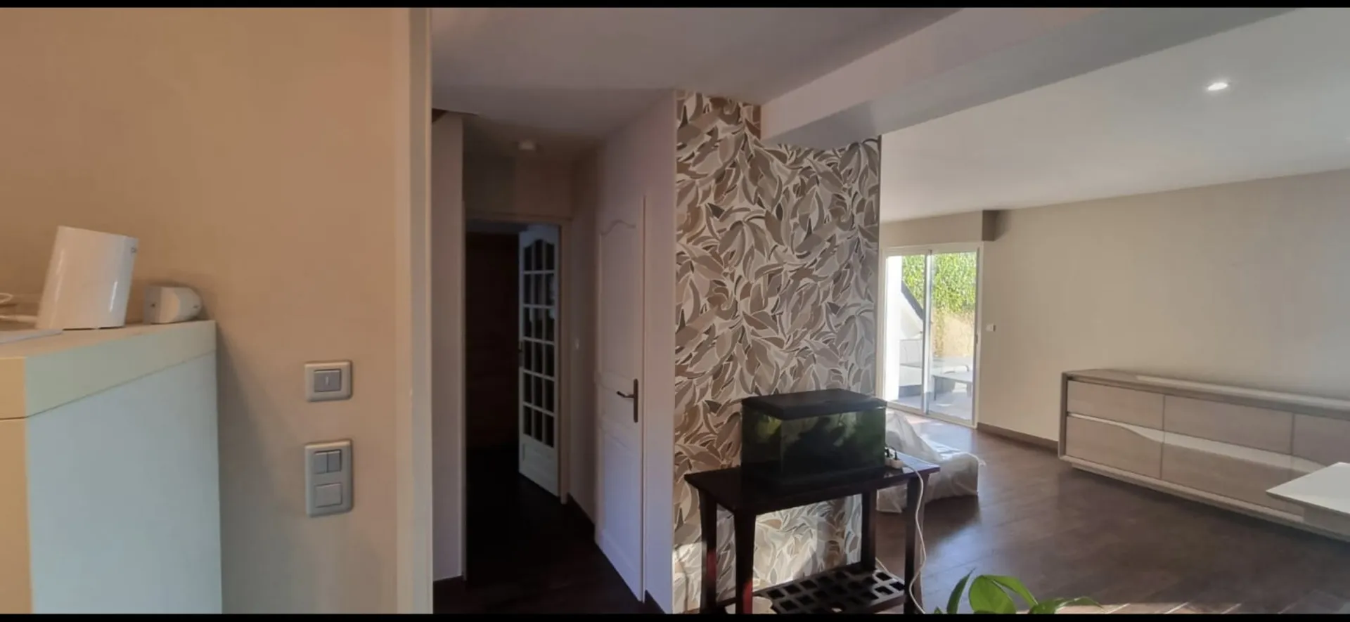 Dans le salon une préparation de support a été effectué et nous lui avons appliqué une impression puis 2 couches de peinture de finition veloutée lavable et pose de papier peint.