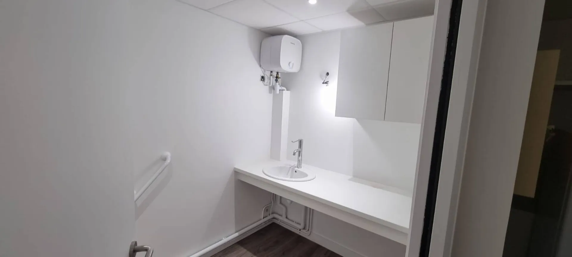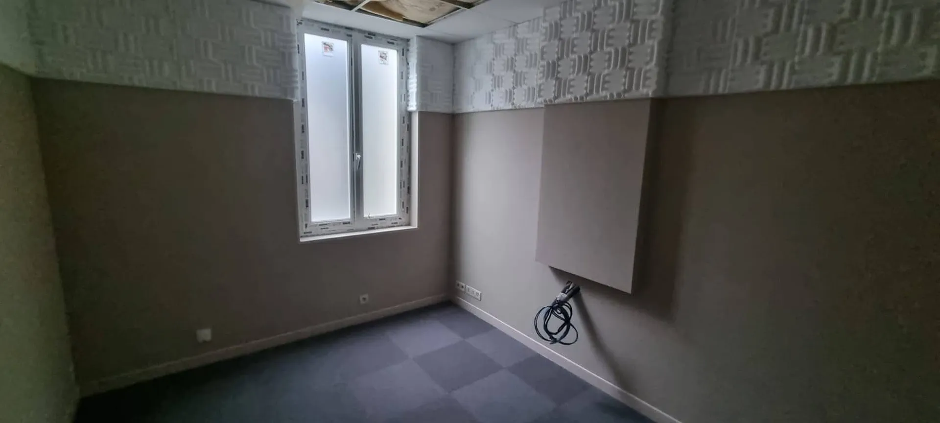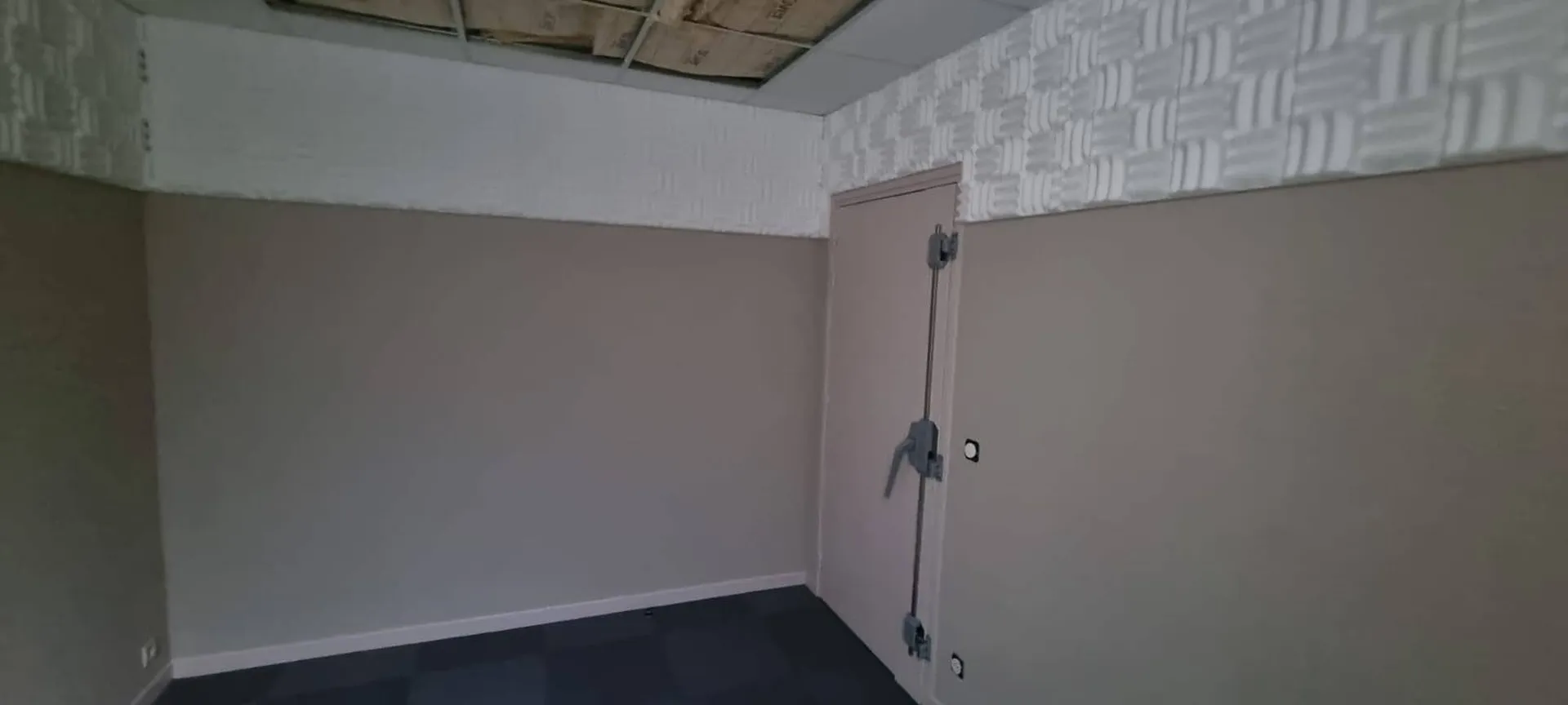 Toute la préparation des supports a été soigneusement effectuée avant la mise en peinture et la pose de dalles phoniques sur les murs.